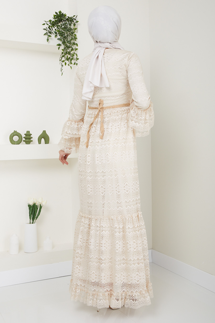 Çiçek Kemerli Danteli Tesettür Elbise - Bej